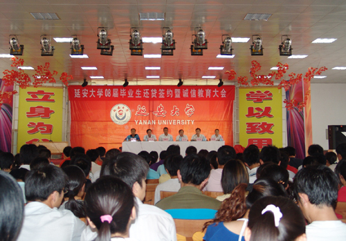 本网讯 6月27日下午,我校在学生活动中心组织召开了2008届毕业生还贷签约暨诚信教育大会,中国人民银行延安中心支行、中国银行延安分行、学生处、各学院辅导员及享受国家助学贷款的500余名学生参加了会议。