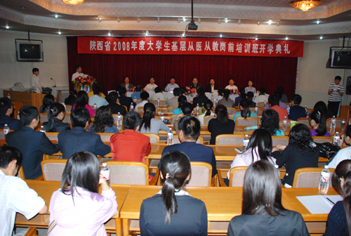 本网讯 6月17日上午,陕西省2008年大学生到基层从医从教岗前培训班开学典礼在我校多功能厅举行。陕西省人事厅党组成员、中国西安人才市场、省人才交流服务中心主任李田,省人才交流服务中心副主任王东成,省人才交流服务中心毕业生工作部副部长赵红,延安市人事局副局长宋小文,延安市人才交流服务中心主任汪洋等及本次培训的98名学员参加了开学典礼。典礼由省人才交流服务中心培训部副部长刘一锋主持。我校党委副书记高延龙、就业指导中心主任马建平出席了开班典礼。