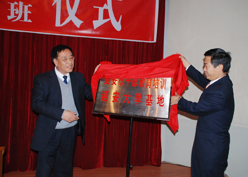 会上,李彦勋副部长首先宣读了《关于建立延安市干部教育培训延安大学基地的意见》。刘建德书记代表培训基地在致辞中表示,延安市把干部教育培训基地建在延大,将培训班办在延大,是对我们的信任,也是对我们工作的支持,我们将尽心尽力,积极配合,精心组织,认真工作,确保培训任务的完成,确保培训工作的质量。随后,蔡钊利部长和刘建德书记共同为基地揭了牌。