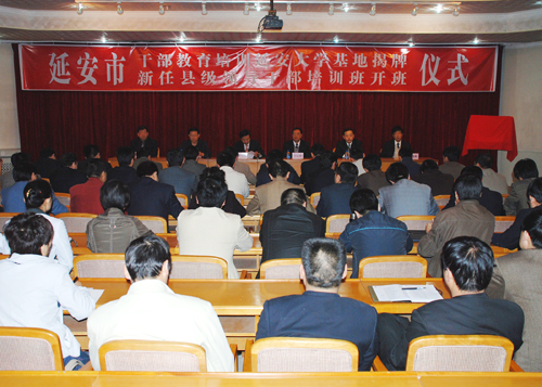本网讯 4月15日上午,延安市干部教育培训延安大学基地揭牌暨新任县级领导干部培训班开班仪式在我校多功能报告厅举行。延安市委常委、组织部部长蔡钊利,我校党委书记刘建德、副校长王延奇、组织部部长张建林,延安市委党校常务副校长陈国昌及培训班全体学员等参加了仪式。仪式由市委组织部副部长、市委干教办主任李彦勋主持。