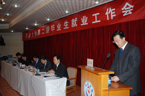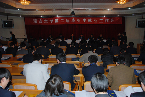 廉振民校长在会上作了题为《转变观念,提高认识,为开创我校就业工作新局面而努力奋斗》的讲话。他在讲话中指出,这次就业工作会议的主要任务是,总结毕业生就业工作的基本经验,分析毕业生就业工作面临的形势,明确今年及今后一段时间毕业生就业工作的任务,探讨毕业生就业工作的新思路、新方法、新途径。廉校长分三个方面,对我校近年来毕业生就业工作取得的成绩和基本经验、我校毕业生就业工作面临的挑战和今后我校毕业生就业工作的思路和举措进行了全面阐述。就业指导中心主任马建平、教务处副处长武忠远、就业培训学院院长韩平分别就《延安大学关于进一步加强就业工作若干意见》、《延安大学关于创新人才培养模式,提高学生就业能力的指导意见》、《关于开展国家职业资格认证考试和培训工作意见及相关问题》等提交讨论的会议材料作了解读和说明。化工学院、医学院、生命科学学院、政法学院、体育学院和文学院就本学院近年来学生就业工作取得的经验进行了大会交流。