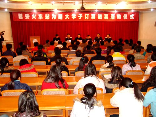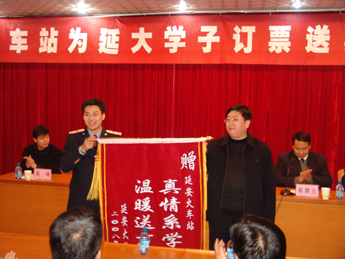 邓经泉站长代表延安火车站表达了愿与我校建立长期友好合作关系的愿望,他同时表明,延安火车站把延安大学学生预定寒假回家车票工作作为一项政治任务来抓,将1月17日、18日、19日三天的火车硬座票全部留给了我校学生,另外还专门开通价位较低的4911次列车,以满足广大同学的返程需要。学生代表许辉姜发了言,对延安火车站对莘莘学子的关心表示了由衷地感谢。