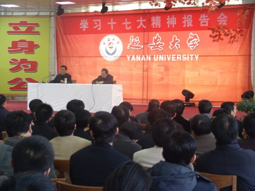 本网讯 12月18日下午,我校校友、北京《百年潮》杂志社原社长、中共中央党史研究室研究员朱地先生来我校作了一场关于学习党的十七大精神的报告会。报告会由宣传部副部长曾鹿平主持,全校处级以上干部、各学院团委书记及政法学院党史专业研究生听了报告。