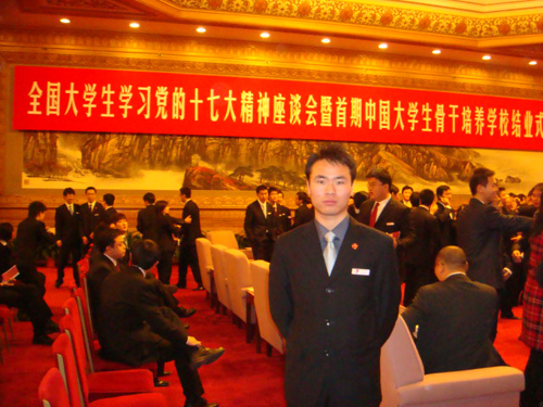本网讯 近期,由共青团中央、全国学联共同主办的“全国大学生学习党的十七大精神座谈会暨首期中国大学生骨干培养学校结业式”在人民大会堂隆重举行。中共中央政治局委员、全国人大常委会副委员长王兆国出席会议并发表了重要讲话。座谈会由团中央书记处第一书记胡春华主持,来自全国各地的300多名大学生代表与会交流近一阶段学习党的十七大精神的收获和体会,我校学生会副主席崔喆作为我校学生代表参加了座谈。