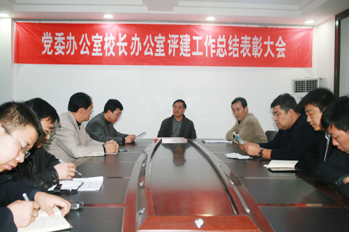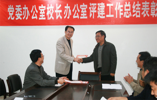 田主任宣读了办公室的表彰决定,对佘占宏、兰鸿涛、刘维政、袁媛、高亭、常润富、王新安等7位同志予以表彰奖励,佘占宏代表获奖人员发了言。刘建德书记向获奖同志颁了奖,校办主任姚正宽代表办公室向会议作了工作总结。