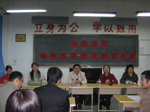本网讯 10月31日晚,人文社科学院在敷仁楼1601室召开了2008届学生报考研究生入学与公务员考试动员暨经验交流会。学院党委书记郝琦教授、教学副院长刘蓉博士、各专业教研室主任、教师代表以及2004级、2005级学生参加了会议,会议由刘蓉副院长主持。