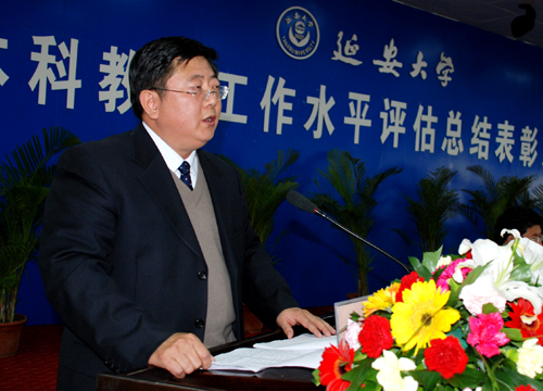 党委书记刘建德在总结讲话中,代表学校党委和行政,向在评估中出了力、流了汗、付出辛勤劳动的全体师生员工表示了亲切的慰问,向所有支持、帮助、保证评估顺利通过的单位、个人表示了衷心的感谢。刘书记要求大家应当正确认识和对待这次评优和奖励,认真总结我们的办学经验。他说,从这次评估中他深刻体会到,全体教工应当具有高度的奉献精神,具有强烈的事业心和工作负责心,具有严格的经常性的管理,具有主人意识和爱校如家的风范,具有良好的精神状态和足够的自信心。刘书记指出,在评估结束后,我们今后要努力做好以下五方面的工作,一是要在做好整改上下功夫;二是要在提高办学层次上下功夫;三是要在提高质量上下功夫;四是要在科研和师资队伍建设上下功夫;五是要在打好延安牌、延大牌上下功夫。
