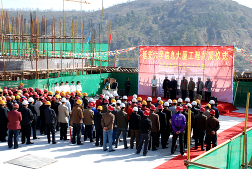 本网讯 10月29日上午,由陕西建筑集团总公司承建的我校信息大厦暨图书馆工程封顶仪式在信息大厦楼顶举行,校领导刘建德、廉振民、刘庆利、张威虎、胡俊生和陕西建筑集团公司副总经理薛永武、承包二部总经理齐科武,延安市建筑工程质量监督站站长万峰、副站长任卫军,西安新业监理咨询有限公司董事长马春茹、经理王双峰、总监唐岗正以及我校基建处、监察处、房产处、财务处、发展规划处、后勤管理处、图书馆等单位的主要负责同志出席了封顶仪式。仪式由副校长张威虎同志主持。