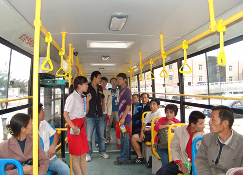 学生志愿者在车上进行宣讲