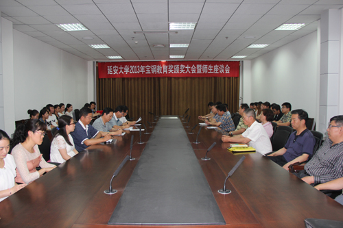 本网讯 6月17日下午,我校在图书馆第一会议室举行2013年宝钢教育奖颁奖大会暨师生座谈会,副校长胡俊生,教务处主要负责人和宝钢教育奖获奖师生、2014年考研工作优胜单位代表、第三届教师教育能力大赛获奖师生及单位代表参加了会议。颁奖大会由教务处处长武忠远主持。