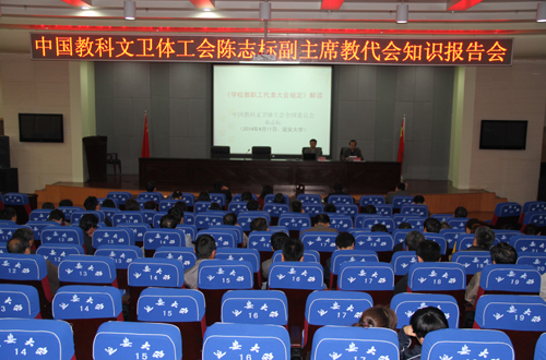座谈结束后,陈志标在我校图书馆十楼报告厅作了题为《学校教职工代表大会规定》解读的报告。我校第四届“双代会”代表、各分会干部聆听了报告。报告会由工会主席白泽生主持。报告中,陈志标副主席从颁布实施《学校教职工代表大会规定》的意义、《学校教职工代表大会规定》的基本内容、学习宣传贯彻落实《学校教职工代表大会规定》的几点思考等方面,对《学校教职工代表大会规定》进行了解读。