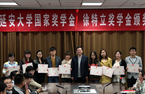 本网讯4月1日下午,我校2013年度国家奖学金和徐特立奖学金颁奖仪式在图书馆二楼会议室举行,校党委副书记田伏虎,学生处全体工作人员、部分辅导员和国家奖学金及徐特立奖学金的获得者参加了颁奖仪式。颁奖仪式由学生处处长高峰主持。