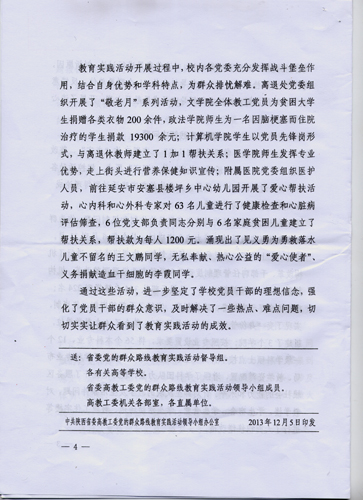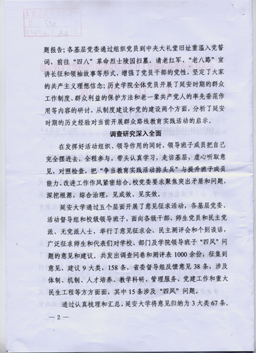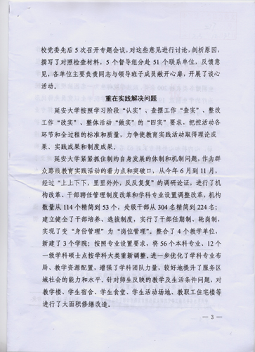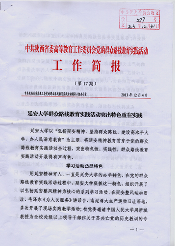 本网讯 由中共陕西省委高教工委党的群众路线教育实践活动领导小组办公室主编的工作简报,在第17期刊登了《延安大学群众路线教育实践活动突出特色重在实践》的文章,认为我校群众路线教育实践活动立足延安优势,学习活动凸显特色,调查研究深入全面,整改落实重在解决实际问题,将延安精神贯穿于教育活动的全过程。省委常委、中共延安市委书记姚引良和省委高教工委书记李仲为等全程指导了我校领导班子的专题民主生活会,并给予了高度评价。