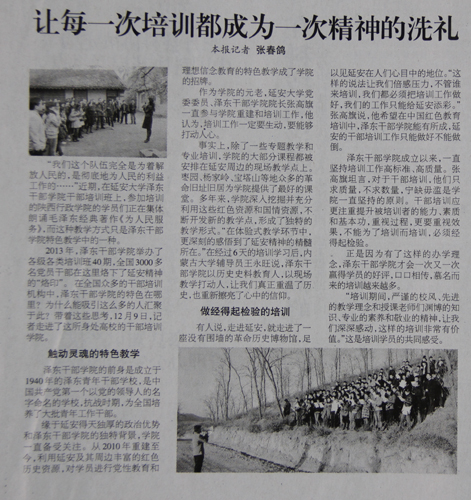 12月19日,《延安日报》在 “党建周刊”以《让每一次培训都成为一次精神的洗礼》为题,报道了我校泽东干部学院的培训工作。