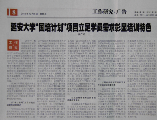 12月6日,《延安日报》在工作研究版,刊登了我校校报记者袁广斌采写的通讯《延安大学“国培计划”项目立足学员需求彰显培训特色》,全面报道了我校三年来实施“国培计划”、开展陕西省中小学教师国家级培训计划的情况。