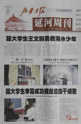 11月24日,《延安日报》在“延河周刊”,发表了该报记者武璇采写的消息《延大学生王文鹏勇救落水少年》,报道了我校医学影像学专业2010级本科生王文鹏奋不顾身、勇救江苏落水少年的先进事迹。