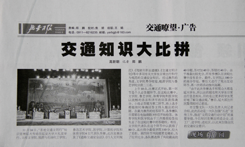 11月28日,《延安日报》在交通瞭望版,发表了通讯员高新朝和该报记者郑鹏采写的现场新闻《交通知识大比拼》,报道了我校开展“圣地交通文明行”知识竞赛的情况。