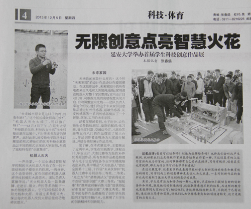 12月5日,《延安日报》在科技体育版,以《无限创意点亮智慧火花——延安大学举办首届学生科技创意作品展》为题,报道了我校信息学院“科技联系你我,科技改变生活”首届创意作品展的情况。