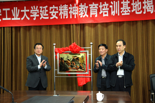 随后,曹克勤组长、廉振民校长和崔智林校长共同为西安工业大学延安精神教育培训基地揭了牌。