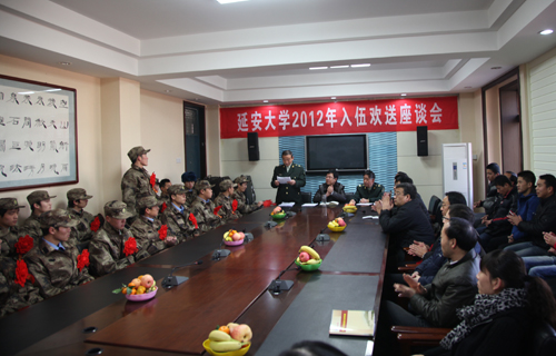 座谈会上,王延海同志宣读了《延安市宝塔区武装部征兵入伍通知》,今年我校共有张伟进等21名男大学生应征入伍,赴新疆、甘肃省军区等部队服役。