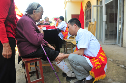捐赠仪式结束后,青年志愿者们在石头沟村党员活动室门前举行了义诊活动。由外科、内科、儿科、药剂经销科等科室的相关医护人员组成的青年志愿者医疗服务队,为石头沟村的群众进行了义诊,为村民们提供了血压测量、医疗咨询、康复指导、药品正确使用及医疗保健知识宣传等。共为当地群众测量血压30余人,义诊60余人,发放药品价值700余元人民币、宣传资料200余份。