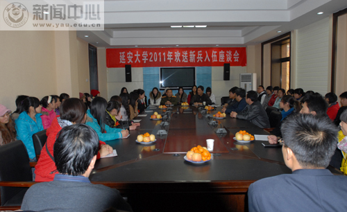 座谈会上,王延海同志宣读了《延安市宝塔区武装部征兵入伍命令》。根据命令,政法学院法学专业2010级学生耿雪、历史文化学院历史学专业2011级学生张莉、计算机学院信息与自动化专业2010及学生胡艳子、教育科学学院初级教育专业2011级学生彭丽远、鲁艺学院舞蹈专业2008级学生朱晨晨及2009级学生牛丽娜、体育学院体育教育专业2011级学生马欢及王慧君等8名学生作为应征入伍的大学生士兵,将赴新疆、甘肃省军区和南海舰队某部服役。