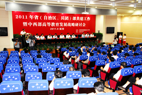 本网讯 今天下午,2011年省(自治区、兵团)部共建工作暨中西部高等教育发展战略研讨会开幕式在我校图书馆学术报告厅举行,教育部党组副书记、副部长杜玉波,陕西省委副书记、省委教育工委书记王侠,省委教育工委副书记、省教育厅厅长杨希文,陕西省委教育工委委员、省政府教育督导团总督学曹普选,中共延安市委副书记、市长梁宏贤,我校党委书记刘建德,教育部直属高校工作司副司长贾德永,直属高校工作司副巡视员牛雁冰,延安市委常委、副市长冯继红,以及各共建高校主要负责同志和分管部门负责人等100余名代表参加了开幕式。开幕式由我校党委副书记、校长崔智林主持。