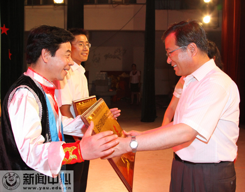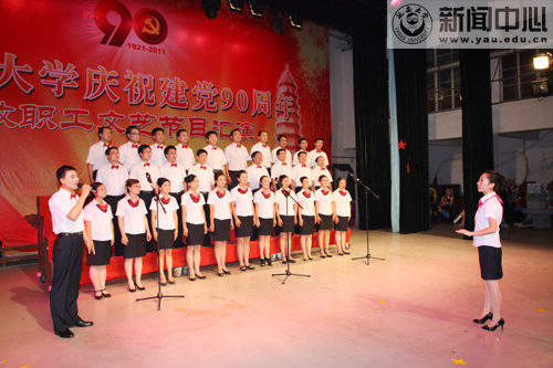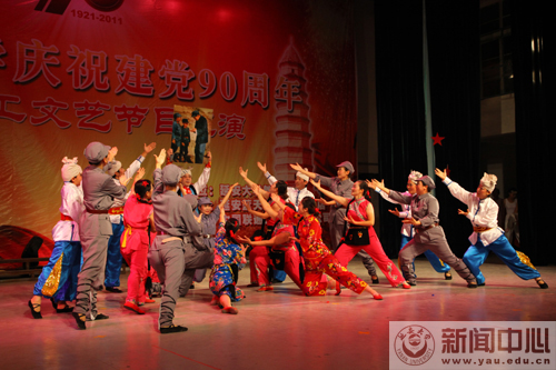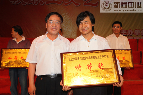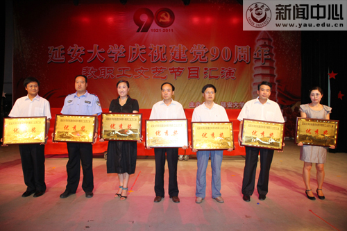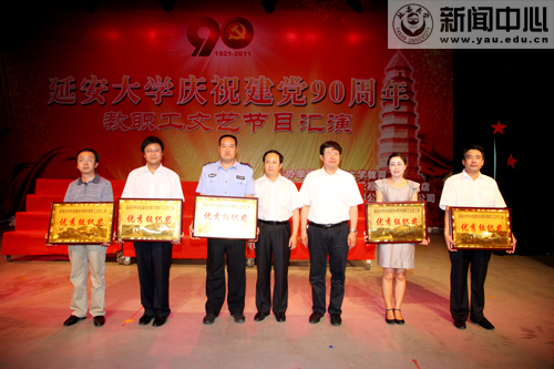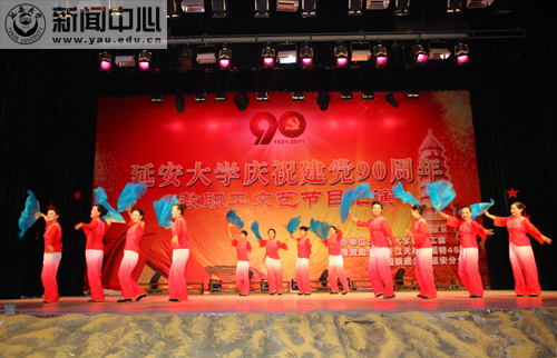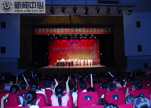 本网讯 为了讴歌中国共产党建党90周年以来领导全国各族人民所取得的建设成就和丰功伟绩,抒发广大教职工爱党、爱国、爱校情怀,激励广大教职工积极投身学校各项事业,促进和谐校园建设,谱写学校改革发展新篇章,展示我校广大教职工爱岗敬业、奋发有为、开拓进取的良好精神风貌,6月30日晚,我校庆祝建党90周年教职工文艺汇演在学生礼堂举行,校领导刘建德、崔智林、高延龙、刘庆利、张威虎、胡俊生,中国联通公司延安分公司总经理徐长青、延安蓝天福海福特汽车销售服务有限公司总经理何琦,以及我校各部门、各学院负责人和1000多名师生共同观看了汇演。我校组织部部长薛美玲、宣传部部长张高旗、团委书记姜庆、鲁迅艺术学院院长刘常喜、文学院院长姚怀山、鲁迅艺术学院副院长王雪燕、工会常务副主席白泽生等担任了汇演比赛的评委。