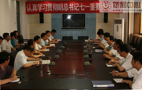 本网讯 今天下午,党委中心学习组在逸夫楼第三会议室举行学习会,学习胡锦涛总书记在庆祝中国共产党成立九十周年大会上的重要讲话,中心学习组全体成员参加了学习会。学习会由党委副书记高延龙主持。