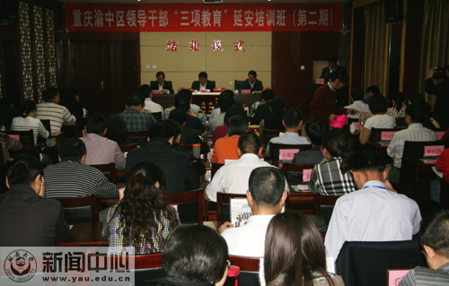 本网讯 5月12日,重庆市渝中区领导干部“三项教育”第二期培训班结业仪式在我校窑苑假日酒店三楼会议室举行,我校党委副书记、工会主席高延龙出席了结业仪式,校办、学生处、马克思主义学院、共建办、接待办、对外联络处等单位的领导和本期培训班全体学员参加了结业仪式。结业仪式由校办主任姚正宽主持。