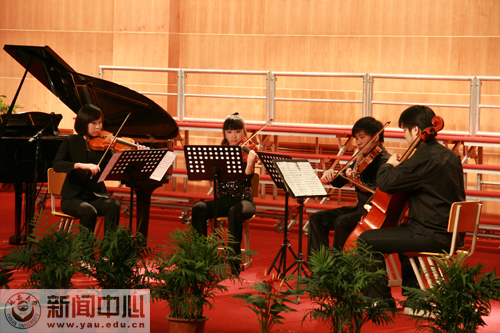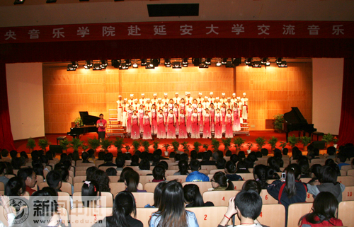 本网讯 4月22日晚,中央音乐学院赴延安大学交流音乐会在我校5·23音乐厅举行,我校党委书记刘建德、校长崔智林、党委副书记高延龙及党委委员、党办主任田伏虎,学生处处长韩卿元、教务处处长齐广才等部门领导和鲁艺学院院长刘常喜等学院领导与中央音乐学院学生处处长李昕,团委书记王京超及随行的辅导员教师,我校鲁艺学院师生600余人观看了演出。