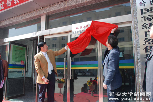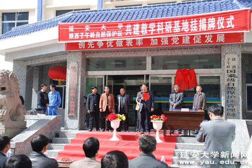 贾生平局长首先介绍了陕西子午岭国家级自然保护区的基本情况,并表达了对与我校进行合作的期待。他表示,这次挂揭牌仪式代表着陕西子午岭国家级自然保护区将与延安大学进行更加密切、长期和友好的合作。随后,孙志宏副院长在致辞中向与会来宾简要介绍了延安大学及生命科学学院办学的基本情况,并从教学实习、产学研等方面,提出了对双方将来进行全面、深入合作的建议。王文强副院长宣读了教学科研基地建设协议书。在与会人员热烈的掌声中,孙志宏副院长代表学校向陕西子午岭国家级自然保护区授予了“科研教学实习基地”的牌匾,并与贾生平局长一起为基地揭了牌。