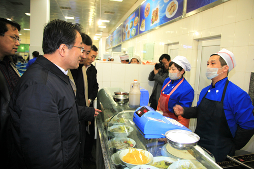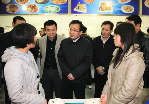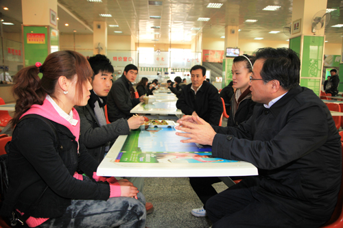 本网讯 今天中午,崔智林校长在校办主任姚正宽、学生处处长韩卿元、后勤处处长台世强等的陪同下,来到位于雅苑教学生活区的学生第三和第四餐厅,检查了餐厅的食品卫生、就餐环境、饭菜质量、服务工作等情况,并与部分学生共进午餐,并在餐桌上与同学们进行了交流。