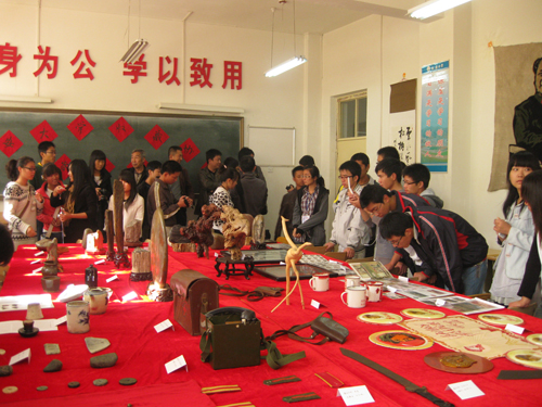 本网讯 10月17日上午,由我校学生收藏协会等学生社团组织发起的藏品展拉开帷幕。藏品展内容丰富,种类多样,有延安新华瓷器厂出产的瓷器、文革时期的丝织毛主席画像及刺绣作品,形状各异的奇石和根雕,还有银元宝、钱币、玉器、字画等。