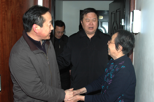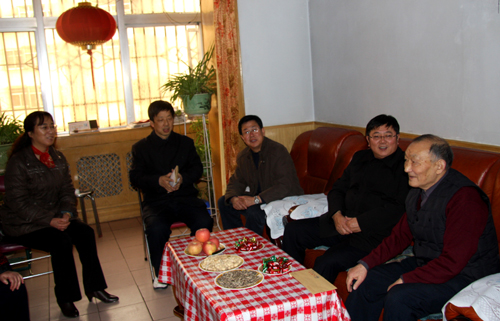 本网讯 在新春佳节即将到来之际,2月8日上午,校党委副书记高延龙,副书记、纪委书记刘庆利,副校长胡俊生、王延奇,在校党委委员、党办主任田伏虎,校办主任姚正宽、组织部部长薛美玲、人事处处长杜红荣、共建办主任马社举、医学院党委书记马延龙、离退休处处长郭新年和组织部副部长拓宏伟、校办副主任兰鸿涛等同志的陪同下,组成4个慰问组,对离退休校级领导、校内省部级劳动模范、全国优秀教师、享受政府特殊津贴专家、有突出贡献专家、民主党派负责人,以及离退休职工代表等进行了走访慰问。