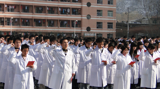 本网讯 为了进一步加强学生职业道德教育和基础文明教育,大力推进校风、学风建设,推进校园精神文明建设。11月25日下午,医学院医学生在学院操场举行了宣誓仪式,医学院院长苗乃周、书记马延龙,各班辅导员以及2008、2009级800多名学生参加了宣誓活动。