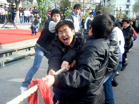 本网讯 日前,由我校学生会举办的以“健康、友谊”为主题的冬季拔河比赛在窑洞广场举行,本次比赛共有来自16个学院的男子组和男女混合组的32支参赛队组成。