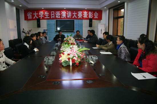 本网讯 11月2日下午,我校在逸夫楼第三会议室举行了十六届陕西省大学生日语演讲大赛获奖师生表彰会。校长廉振民、副校长胡俊生、教务处处长齐广才、外国语学院院长梁润生及外国语学院日语专业教师和学生代表参加了会议。表彰会由国际交流处处长、外语学院书记吴卫东主持。
