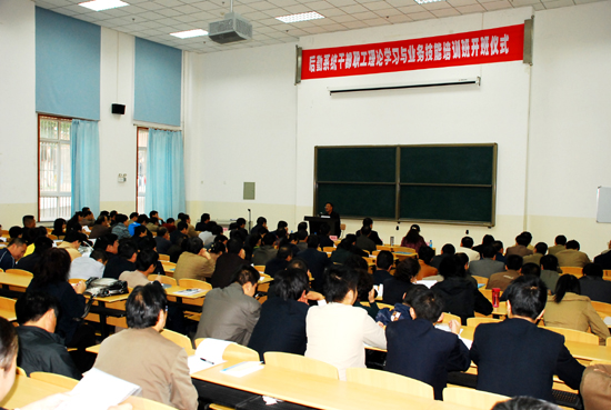 本网讯 10月11日上午,由学校后勤工作领导小组和机关第四党总支联合举办的后勤系统干部职工理论学习和业务技能培训班在玉章楼第五阶梯教室开班,校党委书记刘建德、副校长张威虎、组织部部长薛美玲、人事处处长杜红荣等出席仪式,培训班60余名领导干部及140余名职工参加了开班仪式。开班仪式由副校长王延奇主持。