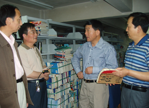 本网讯 6月19日上午,廉校长和胡俊生副校长来到图书馆,视察搬迁准备工作的进展情况。在书库图书打包现场,两位校长仔细地察看了图书打捆程序,对工作人员不畏酷暑、实干苦干的工作作风给予了肯定,并代表学校党政,向大家的辛苦工作表示慰问,同时勉励大家继续发扬不怕苦、不怕累的精神,为新馆顺利搬迁做出贡献。