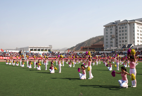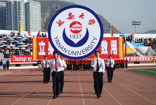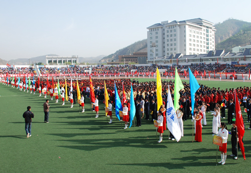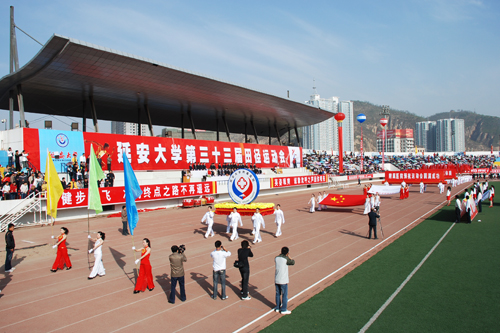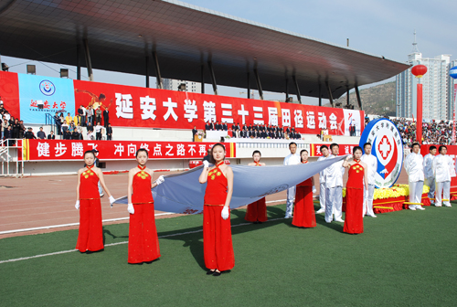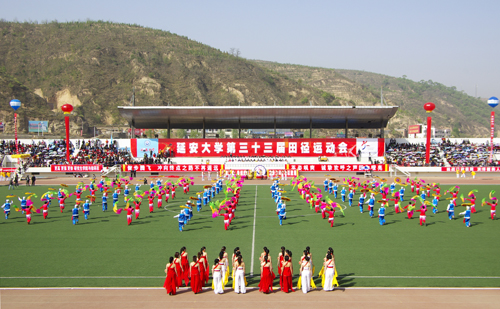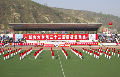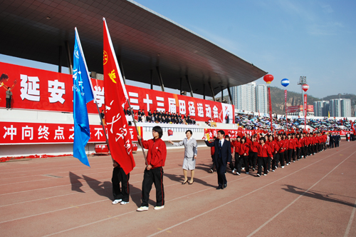 本网讯 4月28日上午,阳光明媚,彩旗飘扬,我校第33届田径运动会开幕式在校体育场隆重举行。校领导刘建德、廉振民、高延龙、刘庆利、许静洪、张威虎、胡俊生,延安市体育局党组书记刘海俊,延安市教育局党委副书记、副局长苏富忠,延安职业技术学院党委副书记高思龙、延安市教育局副局长杨宏录、副调研员刘保东,延安市宝塔区体育中心副主任杨勇、宝塔区教育局党委副书记吴起贵及我校体育工作委员会全体委员和全校15000多名师生参加了开幕式。开幕式由第33届田径运动会执行主席、校体工委副主任、学生处处长韩卿元主持。