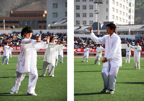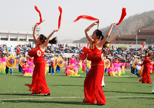 随后,进行了裁判员、运动员的入场仪式。入场仪式结束后,还进行了新编第二套广播体操、太极拳、健美操、秧歌腰鼓等大型的文体表演。