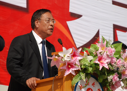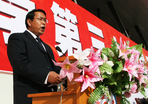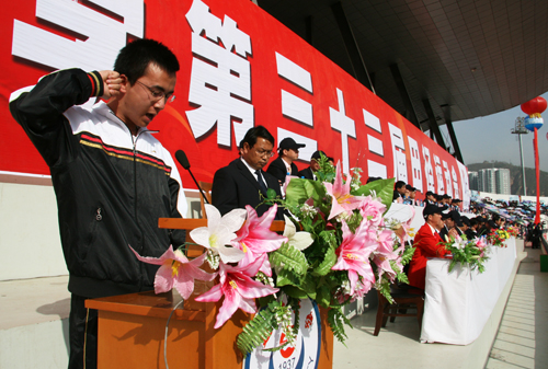 廉振民校长在开幕式上致了辞。他在致辞中指出,田径运动会是我校的一项传统体育活动,它不仅丰富校园文化生活,给师生们提供一个展示自我、发展自我的平台,而且对于弘扬学校锐意进取、开拓创新的精神,进一步加快学校的改革和发展,推进学校的各项建设也具有重要作用。本届运动会的隆重举行,是对我校体育工作、全校师生体育素质和精神风貌的一次检验,也是对运动员和教练员身体素质、竞技技能和心理承受能力等综合素质的考验,更是各参赛单位群体意识、竞技意识、团队精神和顽强拼搏精神的综合展示。化工学院学生赵蛟奎和体育学院教师郝志春分别作为运动员和裁判员代表宣了誓。