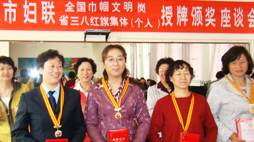 延安市妇联领导为薛美玲(前排左二)等颁发奖牌和荣誉证书