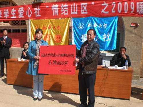 本网讯 3月29日上午,我校学生爱心社在延安市宝塔区枣园镇张天河村举行了捐赠衣物仪式。枣园镇镇长张军,张天河村党支部书记程双虎、村民委员会主任柳叶平,我校学生社联会代表李积云、爱心社社长龚政岚及200多位村民参加了捐赠仪式,延大艺术团和村民联合表演了精彩节目。在本次活动中,爱心社共向张天河村捐赠衣物4500件,张天河村党支部书记向爱心社赠送了锦旗。本次捐赠活动,是情结山区公益活动的启动仪式。