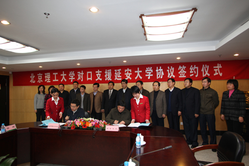 本网讯 1月5日,在新年到来之际,北京理工大学对口支援我校协议签约仪式在北京理工大学国交第一会议室举行,我校校长廉振民,副校长胡俊生、王延奇,党办主任田伏虎,共建办主任马社举,驻京办主任强伟及北京理工大学校长胡海岩,副校长赵显利、李和章,校办主任姚利民和研究生院、教务、科技、实验室管理、组织、人事、宣传、图书馆等部门的主要负责人等参加了签字仪式。签字仪式由北京理工大学主管对口支援延安大学的副校长赵显利主持。