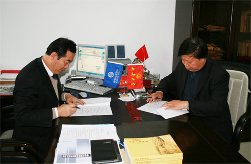 本网讯 11月25日下午,我校首届陕北民歌大奖赛组委会办公室主任、延安大学陕北民歌协会会长乔文章同志与延安移动公司综合办公室主任常飞同志就我校首届陕北民歌大奖赛活动签订了合作协议书。
