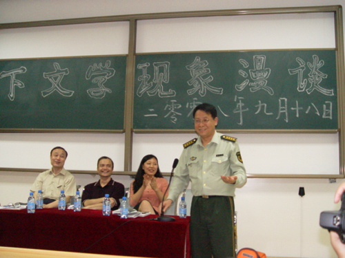 本网讯 9月18日晚,以“当下文学现象漫谈”为主题的文学交流会在玉章楼第八阶梯教室举行,交流会由我校文学研究所所长梁向阳主持。会上,上海文学报社社长兼主编陈歆耕及文艺报评论中心主任石一宁、中国青年报阅读周刊主编徐虹、中国武警杂志社主编王久辛,先后向文学院300多名同学发表了他们对当下文学现象的见解。