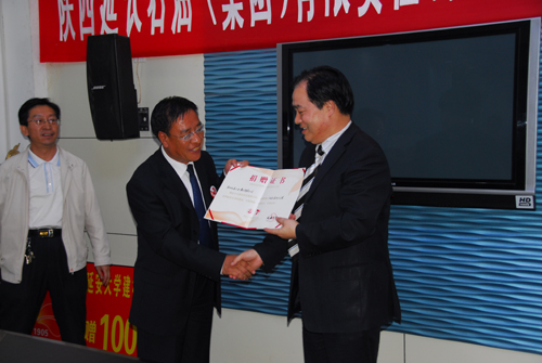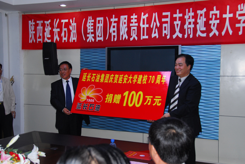 捐赠仪式上,陕西延长石油(集团)有限责任公司总经理、党委副书记张积耀首先讲了话,他对延安大学七十周年校庆表示热烈的祝贺,对延安大学长期以来向延长石油集团有限责任公司输送人才、提供智力支持表示衷心感谢。张总经理还逐一介绍了随同前来的陕西延长石油(集团)有限责任公司几大板块的主要负责人,并宣布陕西延长石油(集团)有限责任公司向我校捐款100万元。
