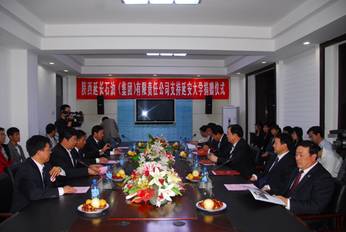 本网讯 9月21日晚,陕西延长石油(集团)有限责任公司支持延安大学捐款仪式在我校逸夫楼第三会议室举行。捐赠仪式由张威虎副校长主持。